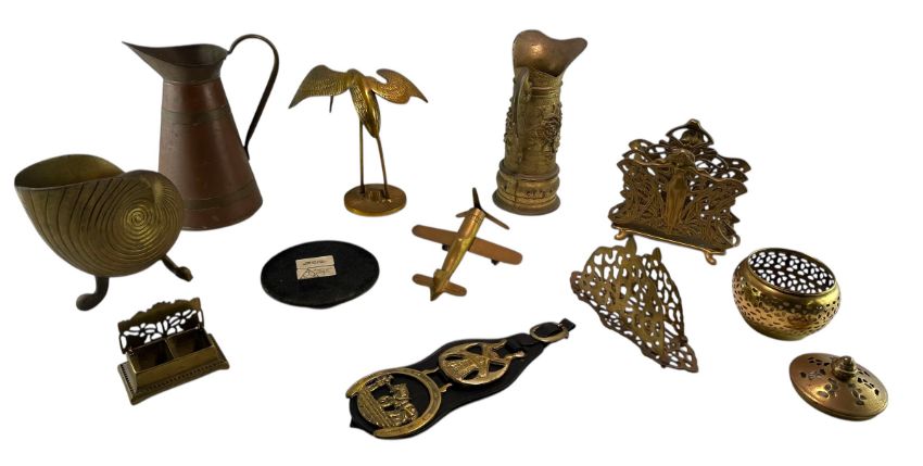 A mixed selection of 20th-century brass pieces. To include a stork on a stand, a cornucopia shell on a stand, two ornate letter racks, an aeroplane on wheels, an art-nouveau style stamp box, a night-light stand, two horse medallions on a leather strap, two jugs, and a lidded pot with cut-out decoration. (11)