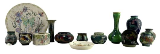 A collection of early 20th century Zuid-Holland - Gouda Pottery. The lot to include a straight spill vase with abstract glaze in green, blue & terracotta; baluster-shaped vase in cobalt blue, turquoise and cobalt blue glaze; a green glazed squatted vase; a squatted vase decorated with purple flowers, number 125; a baluster vase decorated with polychrome floral motifs, signed Nova number 702, three small saucers with floral Art Nouveau motifs numbers 402, 1/280, & 1/27; an hexagonal ginger jar vase decorated with floral & foliate motifs on cream ground. A wall charger plate decorated with butterfly and flowers on white ground, vase number 64, initials WB; plate number 24; five Art Nouveau hand-painted pottery pieces, to include a Zuid-Holland trinket dish with floral decoration, two twin-handled miniature vases, an Art Deco lipped bowl, together with another vase with grape decoration. Together with another similar vase.