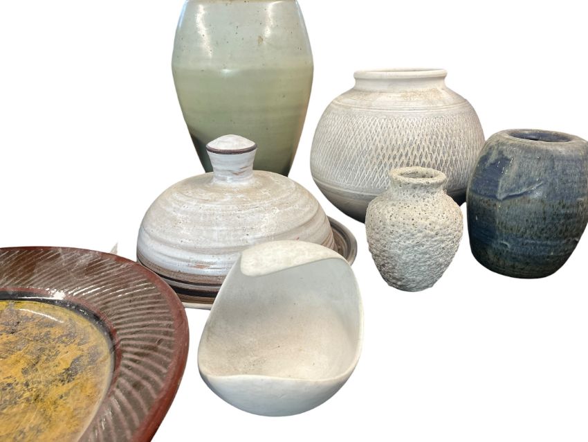 A large collection of vintage 20th century and contemporary studio art pottery items, some by Anthony Cresswell Swann, some illegibly signed and some unsigned. The lot to include large chargers/bowls, lidded tureen tajin bowl, squatted pierced shaped vase, textured vases, swirl vase, baluster vases, extreme flared neck vases, mottled vases, large bottle vase, together with a celadon-like baluster vase & more. To include examples in various firing techniques. (3 boxes)
