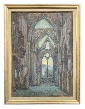 A French impressionists style 20th century pastel and gouache on paper painting of church ruin interior. the painting depicting an emtpy church with a window frame to center. Signed to bottom right corner C Marks