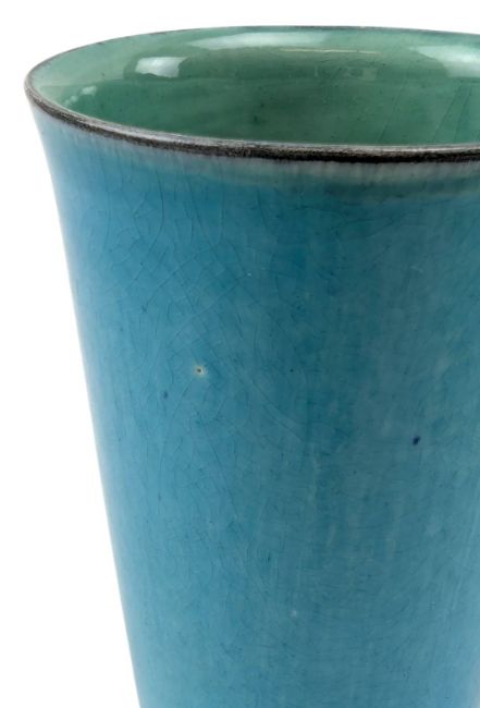Jane Cox (b. 1952) - a studio pottery earthenware beaker of conical form with turquoise glaze. Painted signature to the underside