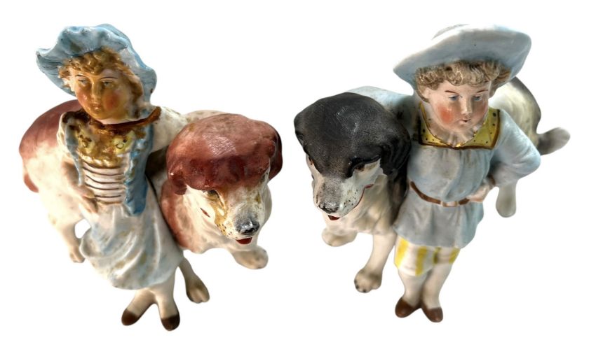 A pair of High-Victorian / early 20th century German Bisque figures. The figures depict a young boy and girl standing beside their dogs. Each with hand-painted detailing. Repair to the girl's head.