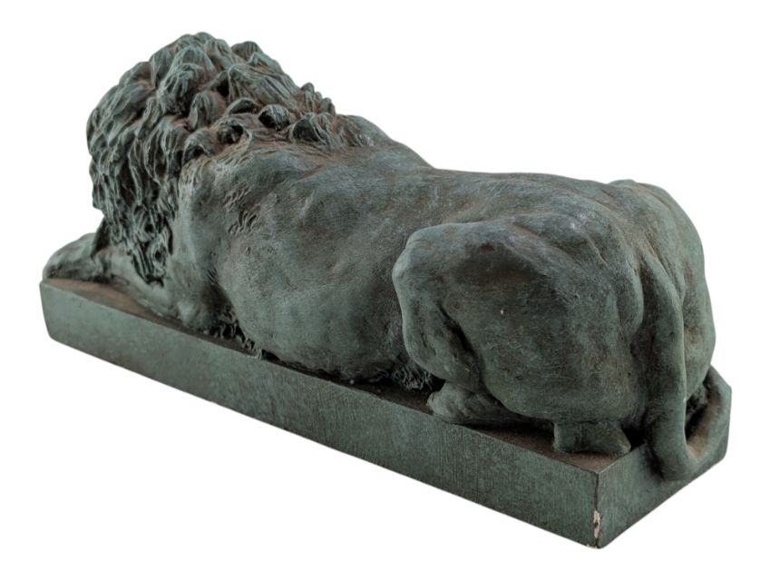 A pair of modern reproductions after Antonio Canova's classical statues of lions, formed from reconstituted stone, finished with a green patina effect to mimic aged bronze. Lions being in a resting and crouching position, raised on plinth bases. Comprised of reproductions of Renaldi's Sleeping Lion and Benaglia's Crouching Lion. From The Chatsworth Collection of reproductions from the home of the Duke and Duchess of Devonshire. Manufactured by The Revival Art Company, Birmingham.