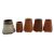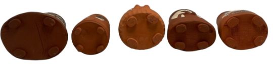 A collection of five Studio Art Pottery stamped decorative terracotta vases. The lot to include two tapering vases decorated with in relief female figures in white cartouche, a tapered vase with tribal portrait decoration to front, a smaller vase with a portrait of a lady, together with a larger shaped vase with two nude female figures on a white ground. Each unglazed but for the rim. Three with impressed stamp J S to udnerside.