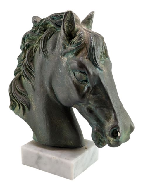A 20th-century bronze effect sculpted horse's head raised on a marble square plinth base. In a classic period style, with green patina effect to mimic aged bronze. Formed from plaster. Lead seal intact between head and base.