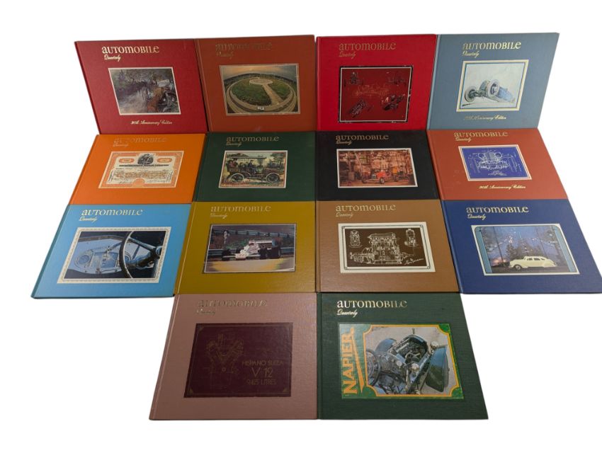A collection of fourteen volumes of Automobile Quarterly, spanning from 1978 to 1983.