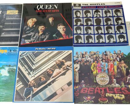 A mixed selection of 9 long play / LP vinyl record albums. The lot includes a first press Beatles A Hard Day's Night (Mono, PMC1239, matrix numbers 481-3N / 482-3N present), Help! (Mono, PMC1255, matrix numbers 549 2 / 550 2), Sgt. Peppers Lonely Hearts Club Band (Stereo, PCS 7027, with insert), Blue Album, Queen Greatest Hits, The Beach Boys etc.
