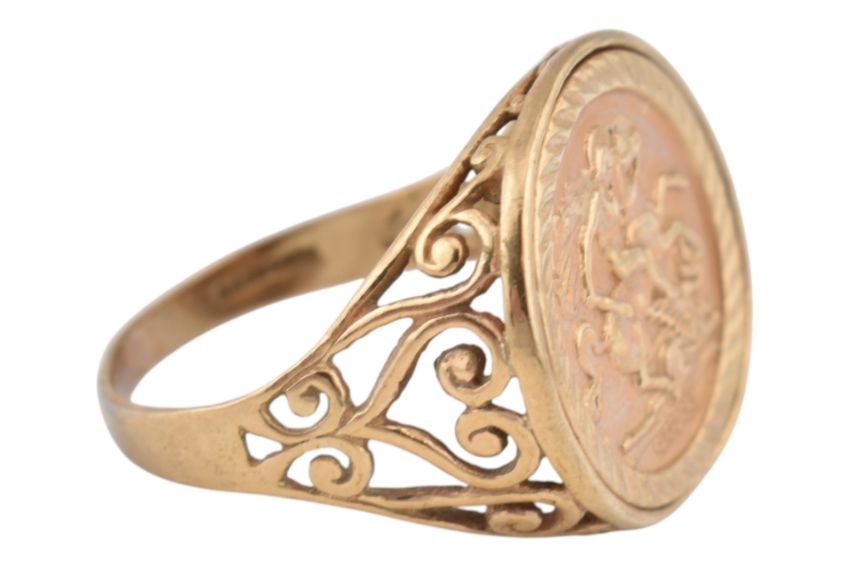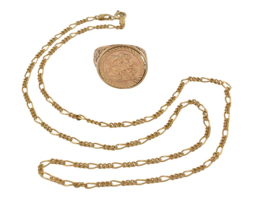A hallmarked 9ct gold figaro chain link necklace, together with a hallmarked 9ct gold faux sovereign ring. Weight 7.4g. Measures 50cm. Size R.5.
