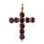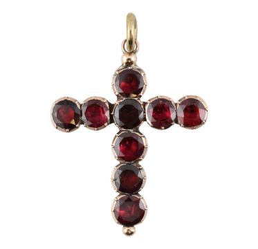 19th century antique gold garnet cross necklace pendant. The pendant set with round cut, collet set garnets, with bail to top. Unmarked tests indicate gold. Measures 4cm including bail.