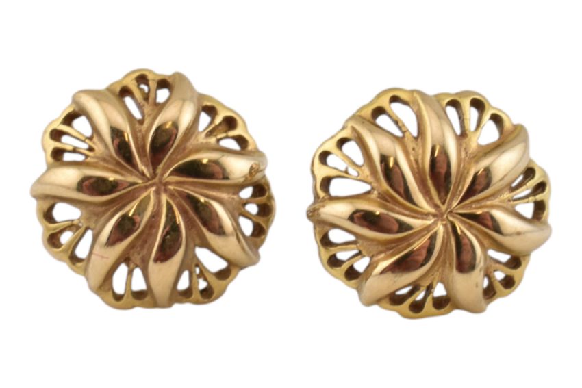 A collection of yellow metal and 9ct gold earrings, including ball, knot, coffee bean, flower. Total weight 3.8g. Largest flower 1.5cm.