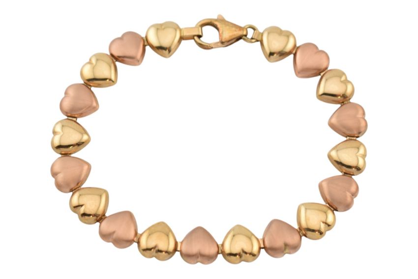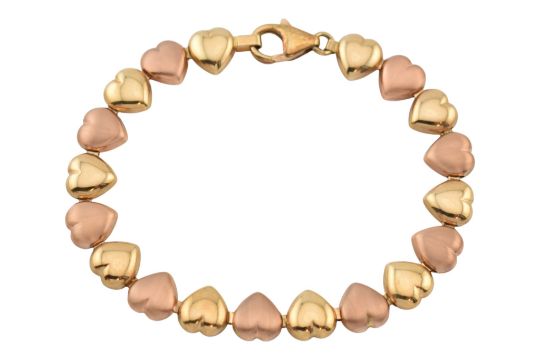 A 14ct gold fancy bi-colour heart link bracelet. Stamped 14k Italy 585. Weight 5.8g. Measures 18cm