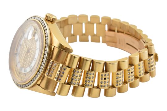 18ct gold Rolex Oyster Perpetual day date bracelet watch. The watch with an aftermarket dial, bezel and bracelet. The bezel set with sixty round brilliant cut diamonds 1.7mm. The dial having a mother-of-pearl chapter ring with Roman numeral hour markers, set with further diamonds, and red stones with a day window to twelve o'clock, and date window to three o'clock. Having an 18K president diamond set bracelet with a deployant clasp. Estimated total diamond weight 2.85ct. Chronometer reference 9375689, circa 1986, Rolex reference 18038. The watch is ticking at the time of cataloguing, but not guaranteed to continue to do so. We do not guarantee any parts are original to the watch. Includes insurance valuation through Ernest Jones from 2012. Total weight 139.4g