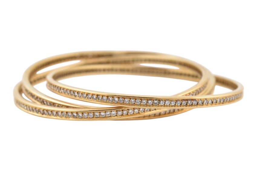Cartier 18ct gold and diamond trinity bangle, certificate and pouch. The bangle is designed as three interlocking hoops, set throughout with round brilliant-cut diamonds. Estimated total diamond weight 6.00cts. Signed Cartier Paris. Numbered 614493. Maker's lozenge and French assay marks to each. Measures inner diameter 6.7cm. With certificate and travel pouch. Condition with kinks to the bands. All stones present. Total weight 55.6g.