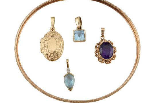 Collection of gold yellow metal and gem-set jewellery. The jewellery to include a pair of topaz pendant earrings, bangle stamped 10k, amethyst pendant stamped 9ct, 3 9ct gold chains. Part chains, two pairs of 9ct gold and gem set earrings, a butterfly pendant and earrings one post missing stamped 375. 9ct gold odd knot earrings, single hoop earrings. locket pendant stamped 10k. Total weight 20g.