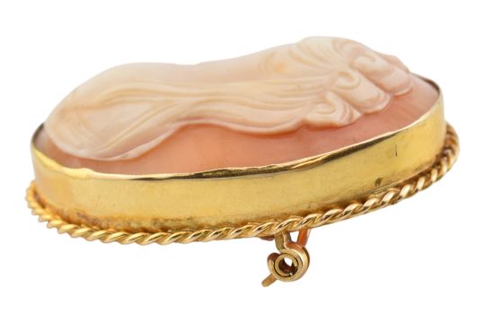 A vintage cameo brooch pin. The brooch stamped 9ct having a carved shell cameo of a woman facing left. Stamped 9ct tests indicate 9ct gold. Total weight 9.9g. Measures 4.3cm.