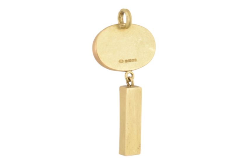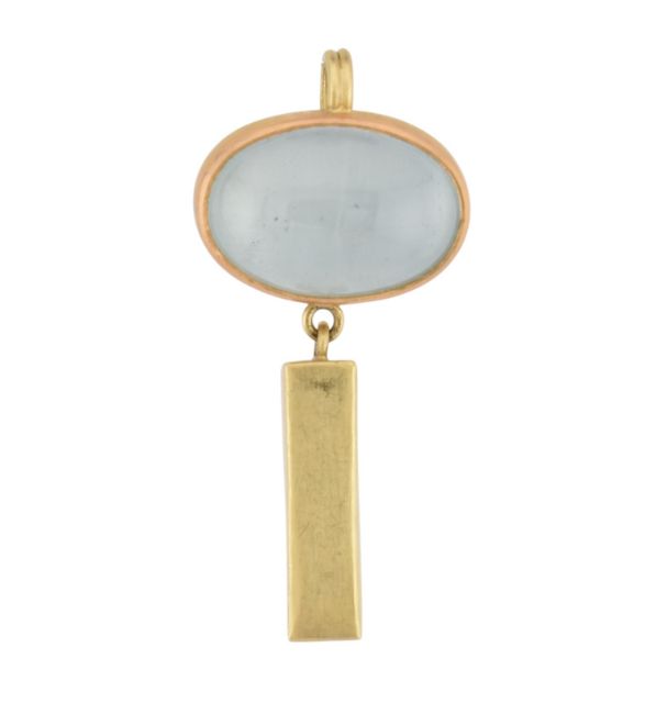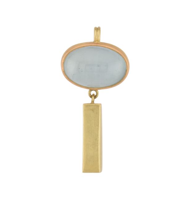 Catherine Mannheim - A contemporary 18ct gold and aquamarine necklace pendant. The pendant with an elongated bar pendant surmounted by an aquamarine cabochon with bail to top. Hallmarked London 2002. Sponsor mark CM. Total weight 8.4g. Measures 4cm length.