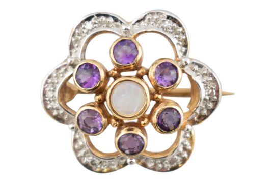 A hallmarked 9ct gold, opal, amethyst and diamond flower brooch pin. Weight 2.8g. Measures 1.8cm