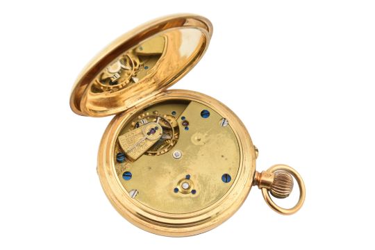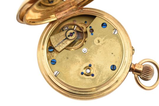 A Victorian hallmarked 18ct gold half hunter pocket watch. The pocket watch with Roman numerals to the chapter ring and blue steel hands. The outer case with enamel Roman numeral having monogram to case verso. Hallmarked Chester, 1894. Measures 4cm excluding winder. Total weight 63.2g