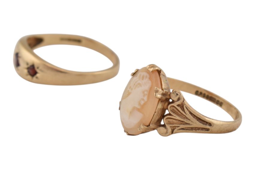 A hallmarked 9ct gold and cameo ring together with a garnet three stone set gypsy ring. Total weight 5.1g. Sizes Q.5 and T.5