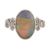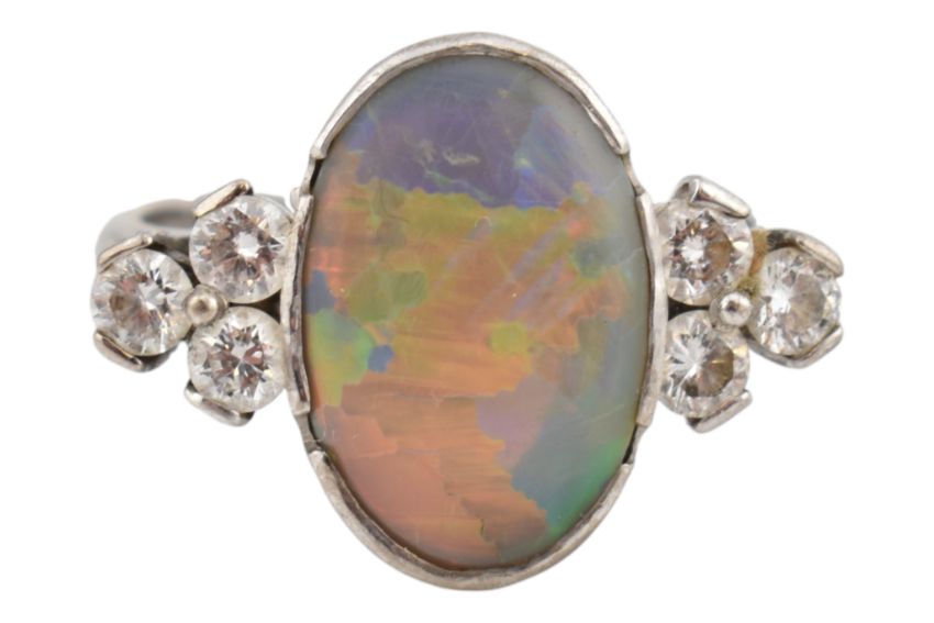 A hallmarked 18ct white gold black opal and diamond contemporary Art Deco style ring. The ring with a central opal cabochon flanked by a trefoil of round brilliant cut diamonds in a white gold setting with yellow gold bead accents. Hallmarked Birmingham. Weight 5.5g. Size O. Head measures 2cm.