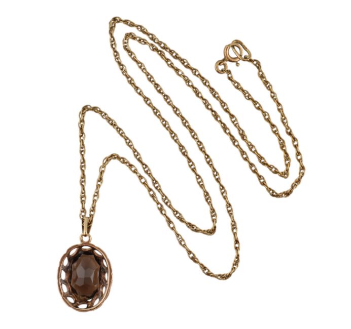 A hallmarked 9ct gold and smoky quartz pendant necklace. Total weight 6g. Measures 54cm. Pendant 2.5cm.