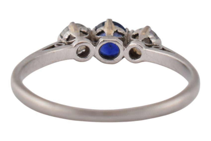 A platinum, diamond and sapphire ring. Stamped plat. Weight 2.5g. Size N