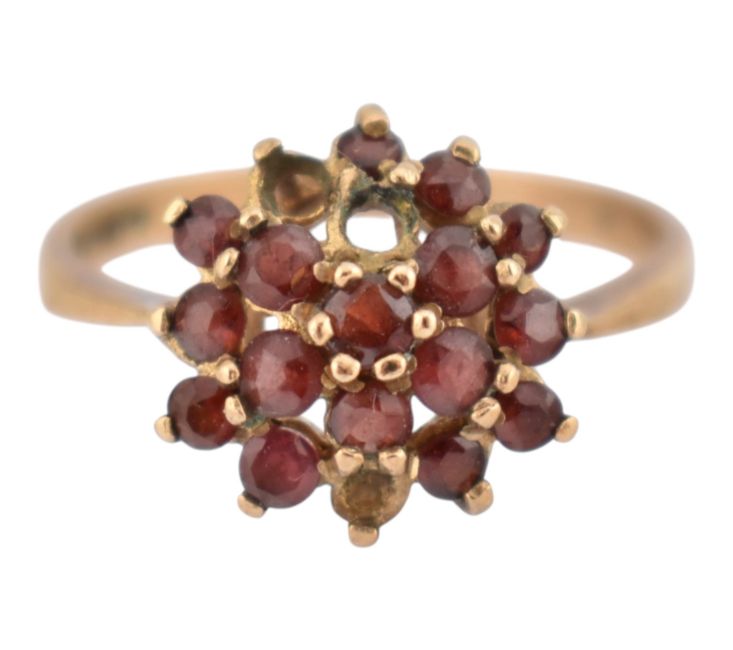 A hallmarked 9ct gold red stone cluster ring. Together with another red single stone ring. Stamped 9ct. Total weight 4.7g. Sizes N & O.5