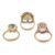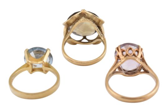 A collection of three hallmarked 9ct gold cocktail dress rings. Each with coloured stones mounted to ornate settings. Two hallmarked London, one Birmingham. Weight 14.4g. Sizes N, O & O.5
