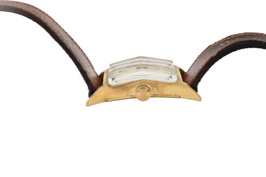 An early 20th century Lord Elgin 14ct Gold Filled Art Deco wristwatch. The movement marked Elgin Cal. 559 hand wind 21 jewel movement. 14k gold filled metal case with a black leather strap. The silvered dial with gold tone hands and baton and Roman numeral qtr hour markers. Sub second dial at 6 o'clock position