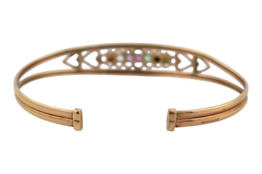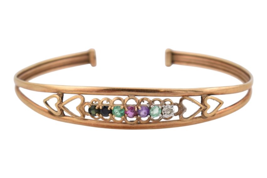 A hallmarked 9ct gold acrostic 'Dearest' gem set bangle. The bangle set with diamond, emerald, amethyst, garnet, emerald, sapphire and tourmaline to heart shoulders. Weight 5.1g. Measures 6cm in approximate diameter.