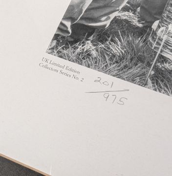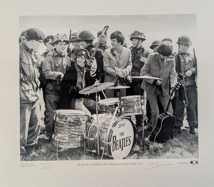 The Beatles - The Beatles on Salisbury Plain during the filming of Help! - Limited Edition 201/975 signed photographic print by Peter Brown. Framed and glazed. Total size: 58cm x 67cm.