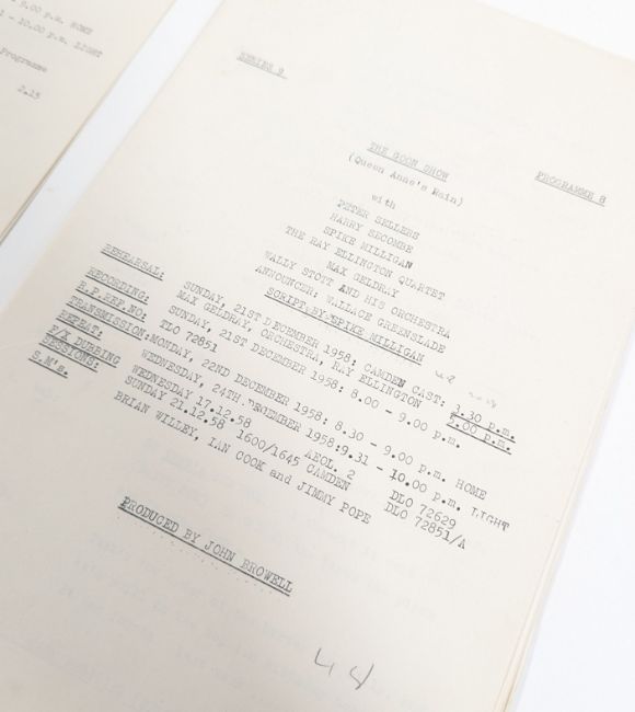 The Goon Show (BBC Radio Comedy Programme 1951-1960 starring Spike Milligan, Harry Secombe and Peter Sellers) – an original recording script used for Series 9, Programme 8 'Queen Anne's Rain’. 28pp, plus cover. With original RX / transmission details sheet. (2)