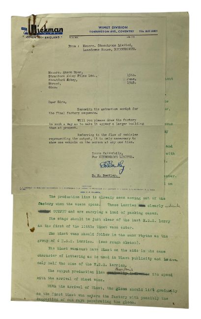 Harold Whitaker (British Animator 1920-2013) - a collection of animation cels, sketches, film and scripts for animated advertisements (c1950). Comprised of a large collection of film negatives for "The Adventures of Soupy", five painted animation cels featuring Soupy and other characters from the Symington Soups advert, a typescript of 'Symington's Soup No. 2 - "No Shooting"' dated 1947, a pencil sketch of a scene with a box of Symington's Soup present, a typescript for an advert for Wimet Age, and two large animation cels depicting eight babies wearing top hats and carrying a horn to be used in an advert for Johnson & Johnson baby powder. Dated around the 1940s and 1950s, when Whitaker was working for Anson Dyer and then Halas and Batchelor.