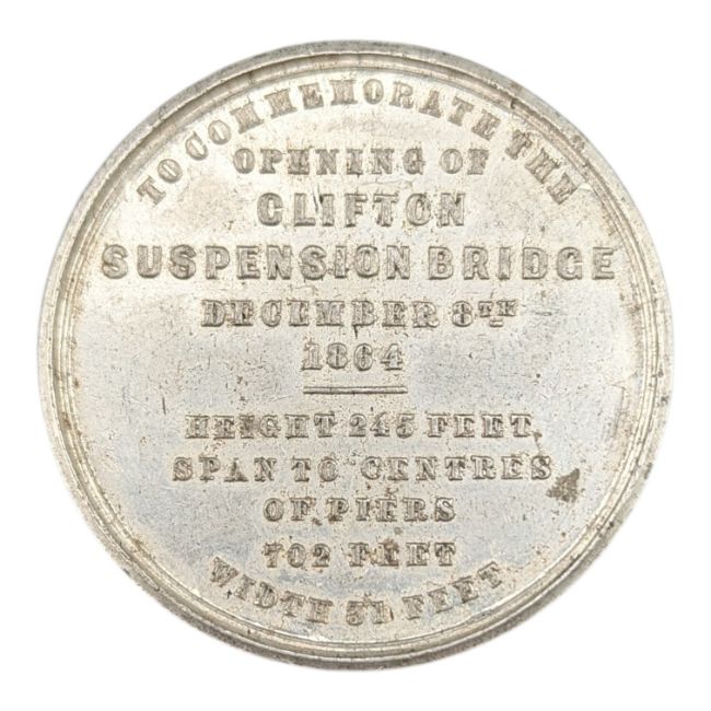 Reverse – TO COMMEMORATE THE OPENING OF CLIFTON SUSPENSION BRIDGE DECEMBER 8TH 1364 HEIGHT ABOVE HIGH WATER MARK 245 FEET SPAN TO CENTRES OF PIERS 702 FEETS INCHES WIDTH 51 FEET DEFLECTION OF, CHAINS 70 FEET STRENGTH 7000 TONS
