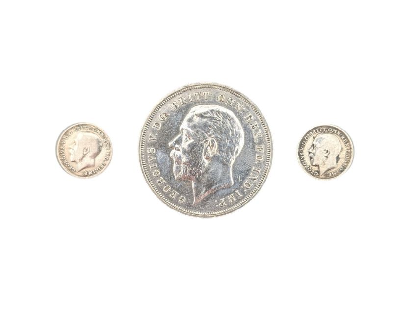 Alongside two King George V .925 silver (1913,1919) Three Pence coins.