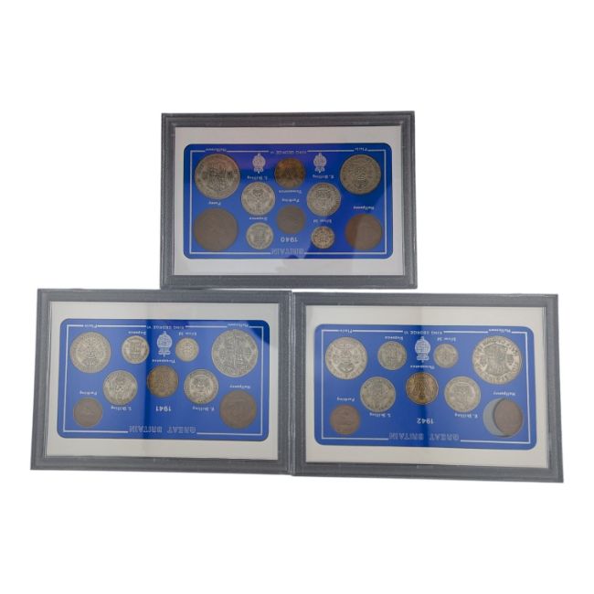 A collection of three 20th century British circulated coin sets. Each set in plastic casing, with the sets including Half Crown, Florin, Shilling, Sixpence, Three Pence, One Penny, Half Penny, and Farthing coins. Including years 1940, 1941, and 1942.