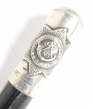 Two WWII Second World War British military regiment swagger sticks. One hallmarked silver Shropshire Light Infantry example, the other Gloucestershire Regiment. Larger measures approx 82cm.
