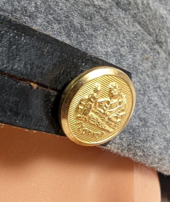 A vintage US United States Civil War style Confederate State Kepi hat of grey wool construction with a gold bullion C.S badge and leather peak together with a British Army RAF blue canteen water bottle.