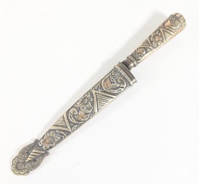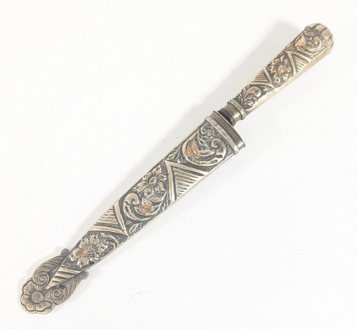An original South American (Argentina) Gaucho knife dagger. The sheath and handle embossed with flowers and scrolling foliage and the blade stamped for maker 'Ju-Ca Tandil Argentina'. Measures approx 32cm.