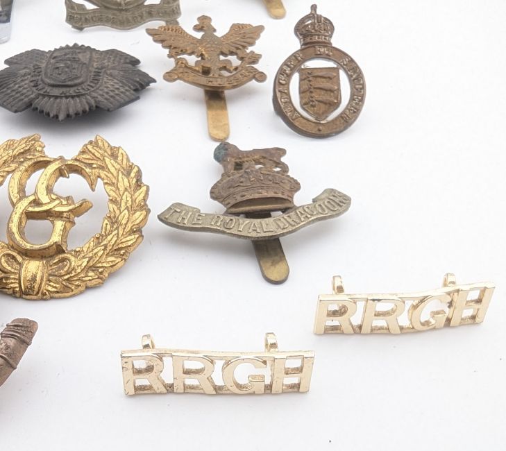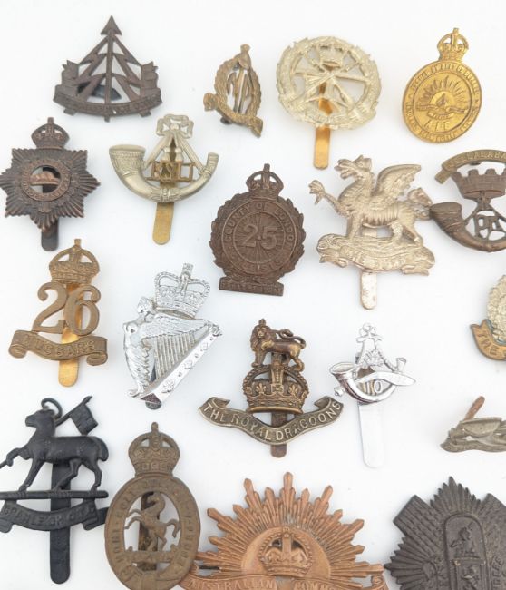 A collection of WWII Second World War military regiment cap badges to include; The Royal Dragoons, Cape Town Highlanders, Somerset Light Infantry, Suffolk Regiment, The Buffs, 26th Hussars, Reconnaissance Corps, Honourable Artillery Company, Australian 'Returned From Active Service', Kings Shropshire Light Infantry