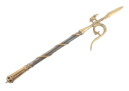 A vintage Indian Elephant Goad / Bullhook / Ankus / Ankush having leaf shaped terminal spike, coiled serpent with hooked tail and standing elephant. Brass snake coiled around the shaft. Measures approx 54cm.