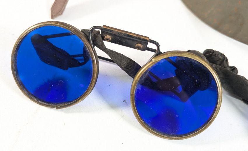 A collection of assorted WWII Second World War militaria to include; ARP Air Raid Precautions Fire incendiary fire fighting goggles, a pair of splinter style / anti flak goggles, 1941 dated Zukerman helmet, leather RAF Royal Air Force flying helmet / dispatch rider helmet and a makeshift improvised helmet in a tobacco tin.