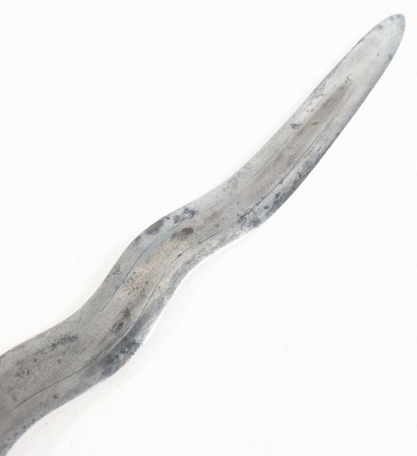 A South East Asian (Philippines) Kris / Kalis sword having a hooked 'bird head' pommel, plaited grip, winged guard at the base of the blade held in place by a copper clamp and deep groves carved down from the ricasso. Wavy blade terminating in a straight tip. Measures approx 60cm.