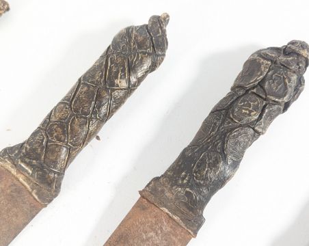 A 19th Century Sudanese Mahdist People triple knife dagger. Three daggers with etched blades, two curved, one straight, housed within a Nile skin crocodile scabbard. Measures approx 44cm.