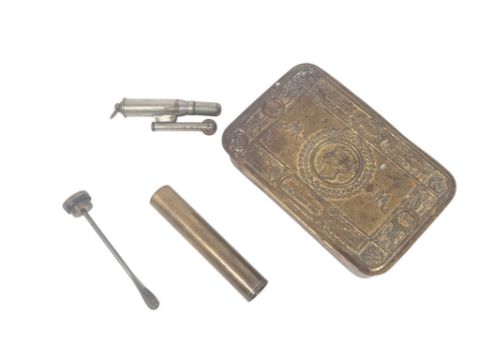 An original WWI First World War Princess Mary 1914 Christmas gift tin, along with an associated trench cigarette lighter and a Lee Enfield rifle oil bottle. (3)