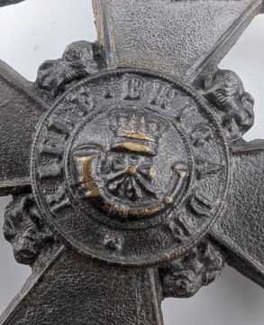 A pre 1908 Boomsbury Rifles Volunteer Corps Shako cap badge. The badge having a crowned strung bugle to the centre, 'Rifle Brigade' to the circlet, banners with 'Bloomsbury Rifles' and 'The Prince Consort's Own' inscribed, and topped with a crown. x3 lugs to the verso. Measures approx. 10cm.