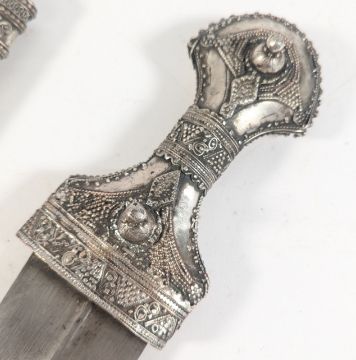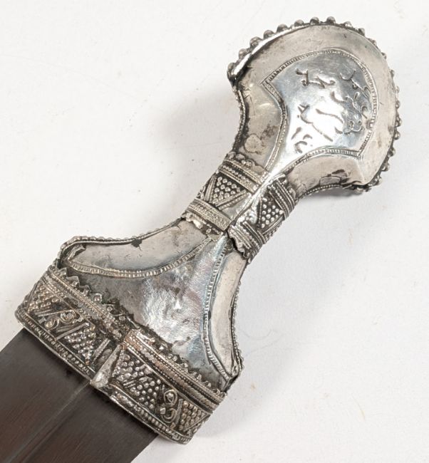 An early 20th Century Middle Eastern / Yemen Khanjar / Jambiya silver dagger. Characteristic hilt finely decorated with granulation details and round protrusions, the curved blade housed in a matching scabbard with filigree metalwork and further granulation. Measures approx 43cm.