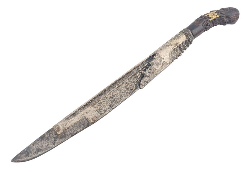 An 18th Century Ceylonese (Sri Lankda) Piha Kaetta / Kandyan knife dagger having a carved wooden grip, reinforced floral carved plates at the ferrule and further embossed blade and fuller. Measures approx 24cm.