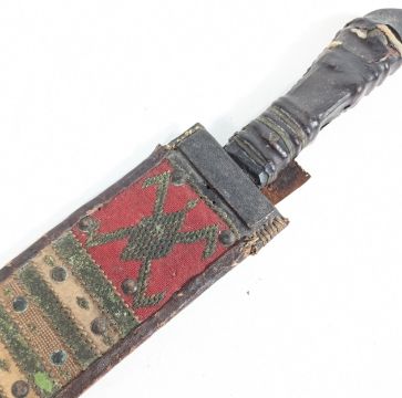 A West African Yoruba People tribal machete knife housed in a decorative scabbard backed with animal hide and a woven top piece with metal studs. Blade stamped for Joseph Beal & Sons, Sheffield. Measures approx 51cm.