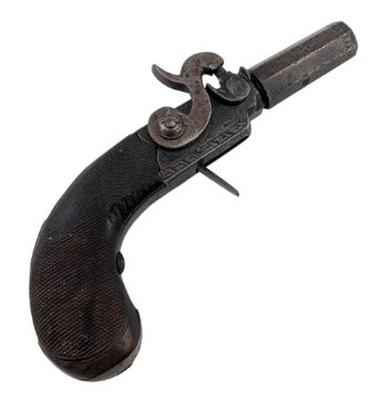 A 19th Century Victorian percussion cap hammer action pocket pistol / muff pistol. Chequered wooden grip, foliate scroll lockplates and screw off octagonal barrel with proof stamp. Mechanism very stiff but will cock, half cock and fire. Measures approx 12cm.